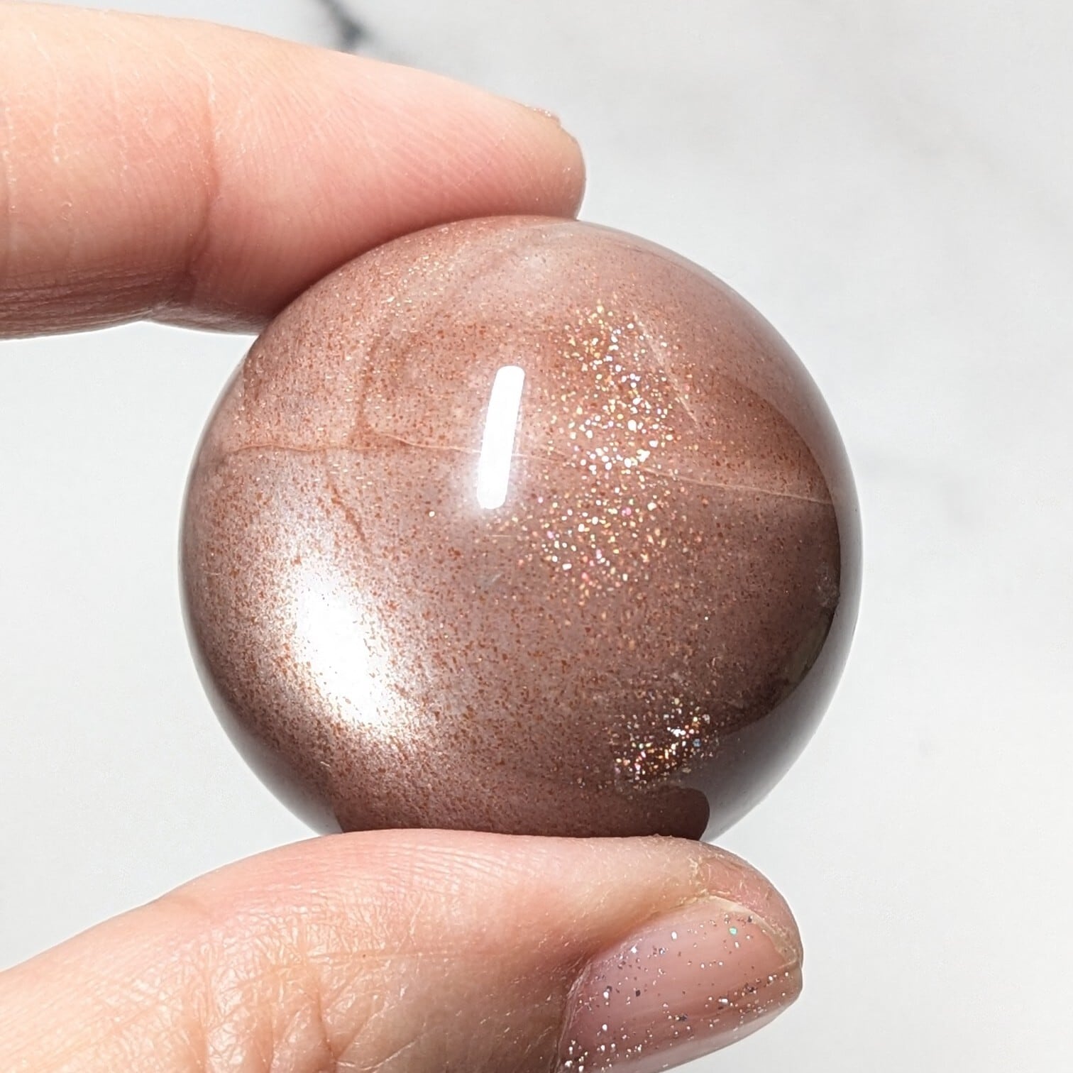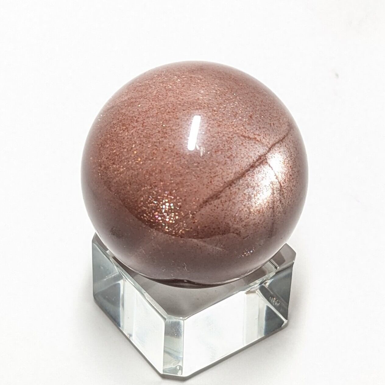 美しいはっきりとした白いシラーに、ゴールド系だけでなく虹色のキラキラのラメが広範囲にひろがるサンアンドムーンストーンの高品質のスフィアです。ぜひ動画でご確認ください。マットなすり傷がありますのでご了承ください。